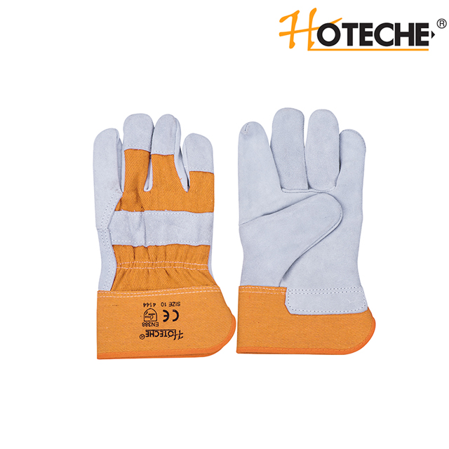 - Cow split leather - Rubberized safety cuff - Striped fabric for back - Packing:hanger card